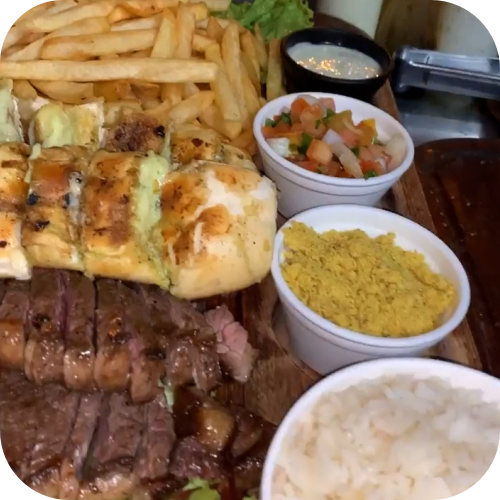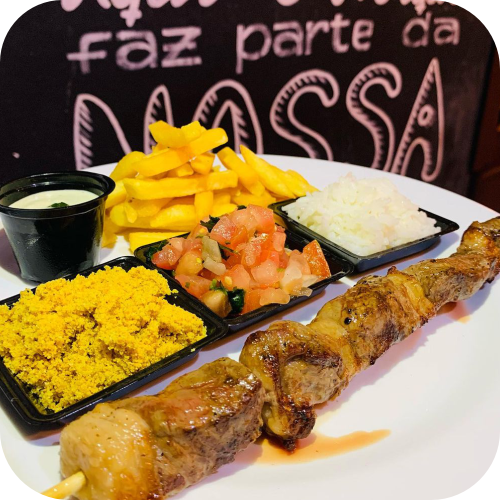 1 Espeto, Farofa, Vinagrete, Arroz e Fritas